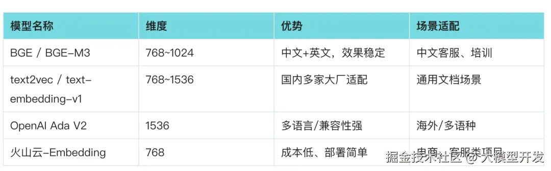 - 嵌入不要贪维度,维度高 → 向量库空间大 → 查询慢。
