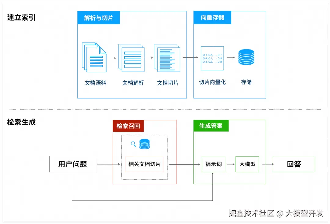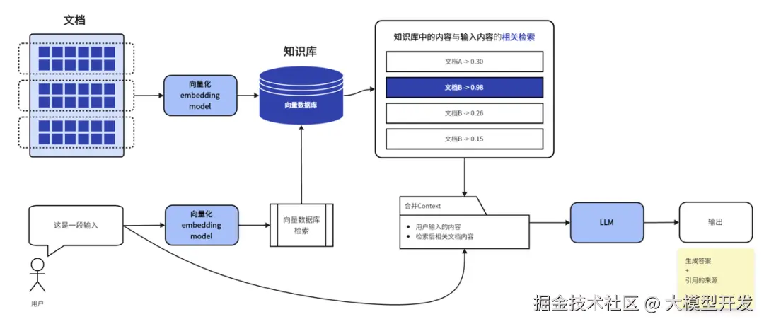 文档接入 ↓智能切块(Chunking) ↓文本嵌入(Embedding) ↓向量存储 + 检索(Vector DB / Hybrid Retrieval) ↓Prompt增强 + 文本拼接 ↓大模型生成(LLM Answer)