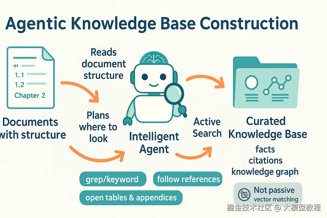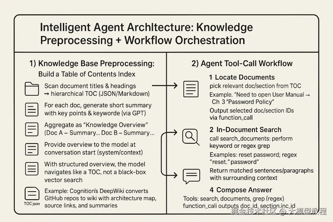 针对上述局限,我们发现利用智能* Agent*(智能体)的方法构建知识库,即赋予大模型类似人类研究员的能力:让它主动“阅读”文档结构,自己决定去哪里查找信息,而非被动依赖向量匹配。其核心思想包括:
