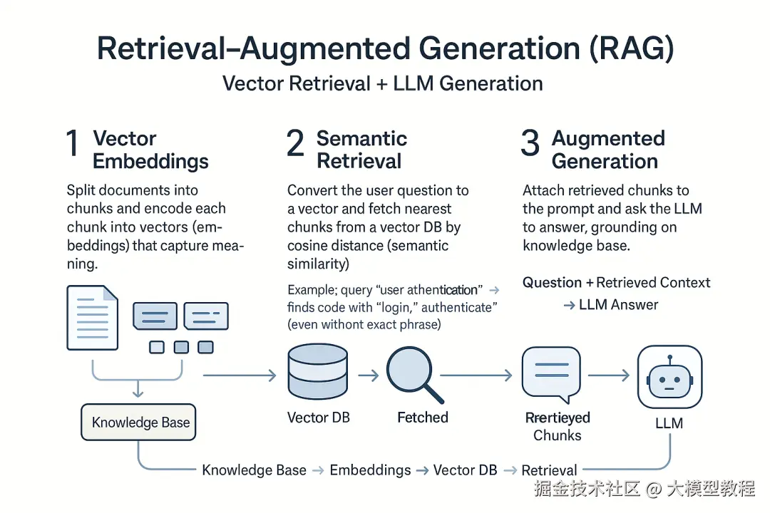 语义检索:用户提问时,也将问题转换为向量,在向量数据库中寻找“距离”最近的文档段落,即语义上最相关的内容。这种向量检索不依赖关键字精确匹配,而是通过embedding捕捉文本语义,能找到包含同义表达的内容。例如,搜索代码库里的“用户认证”,向量检索可返回包含“login”、“authenticate”等词的相关函数,即使没有出现精确的“用户认证”字样。