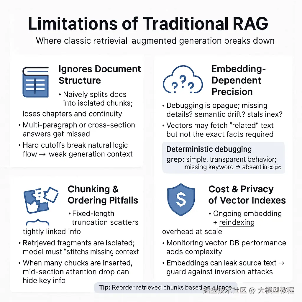 局限: 然而,基础RAG系统也存在不少不足。首先,忽视文档结构。经典RAG将文档机械地切成独立片段,丢失了章节层次和上下文连贯性。如果答案涉及多个段落关联或跨章节的信息,简单的相似度检索往往顾及不到。将长文档硬切会破坏其自然逻辑flow,导致模型生成时缺乏重要上下文。其次,检索精度依赖嵌入质量。当向量匹配失灵时,调试问题常变成噩梦——究竟是嵌入向量没表示出关键细节?语义空间偏差?还是索引过期未包含最新内容?。向量检索有时匹配的是大致相关的段落,却未必包含问题所需的具体事实。相反,传统关键字搜索(如grep)行为简单可预期:搜索不到某关键词,就说明文档里没有,这种确定性在诊断检索问题时非常宝贵。再次,段落截断与顺序问题也会影响效果。RAG常按固定长度截断文本,可能把紧密关联的信息分散在不同片段中,导致检索返回的碎片各自孤立,模型难以拼凑完整答。而当检索返回多个片段时,如何排序放入Prompt也有讲究。如果关键内容被排在中间,模型注意力可能不足,出现“中段遗失”现象,大幅降低答案准确率。最后,维护大规模向量索引也有成本与隐私问题:定期嵌入新数据、监控向量库性能都增加复杂度;向量可能泄露原文信息,需要防范embedding反推原文的风险。