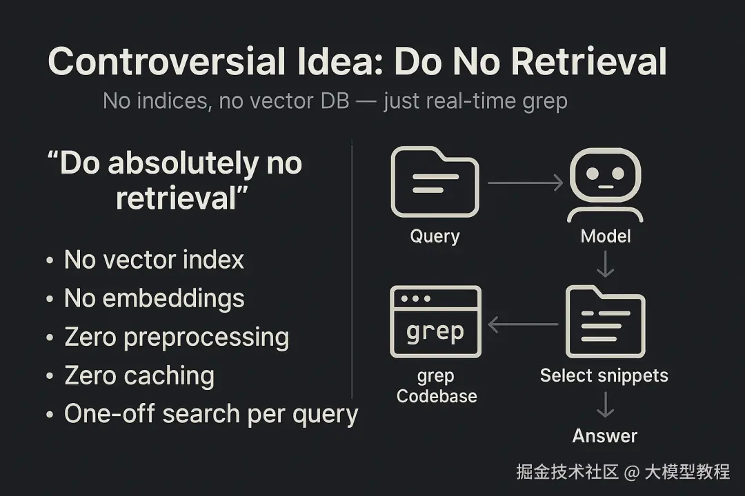 有趣的是,Claude Code 团队的实践引出一个颇具争议的理念: “完全不做任何检索” 。所谓“不检索”,并非指AI凭空作答,而是指不构建专门的检索索引和数据库,一切信息获取都依赖实时读取和模型自身。这在ClaudeCode中体现为:没有向量索引、没有代码片段Embedding,Claude每次回答问题时都现用grep从源码中查找需要的内容。换言之,零预处理,零缓存,一次一查。