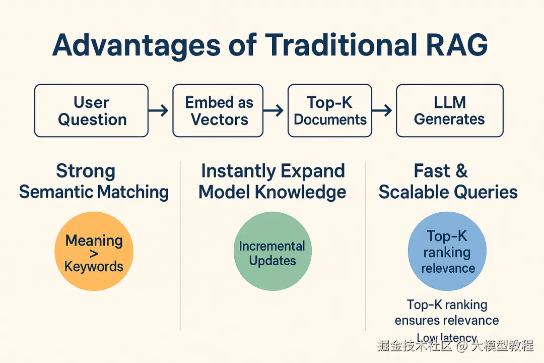 优势: 传统RAG方法简单有效,是当前业界应用最广的方案。其优点在于:首先,语义匹配能力强。通过向量表示,模型能基于含义而非关键词找到相关内容。这使用户不必精确记忆知识库里的措辞,用自己的语言提问也能检索到答案。例如,上述向量检索能跨越不同表述找到同一概念的资料。其次,RAG可以即时扩充模型知识。当有新文档加入,只需更新向量索引,模型就能检索并利用最新信息回答问题,这解决了LLM训练后知识固化的问题。此外,向量数据库经过优化,查询速度快,能应对大规模知识库,并支持Top-K排序确保返回最相关内容。