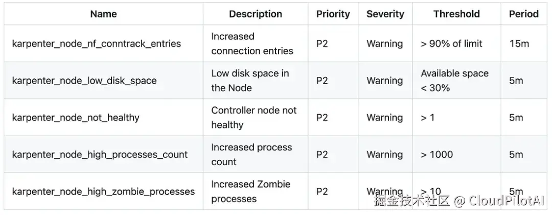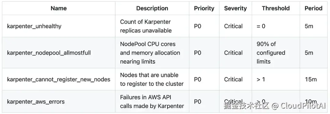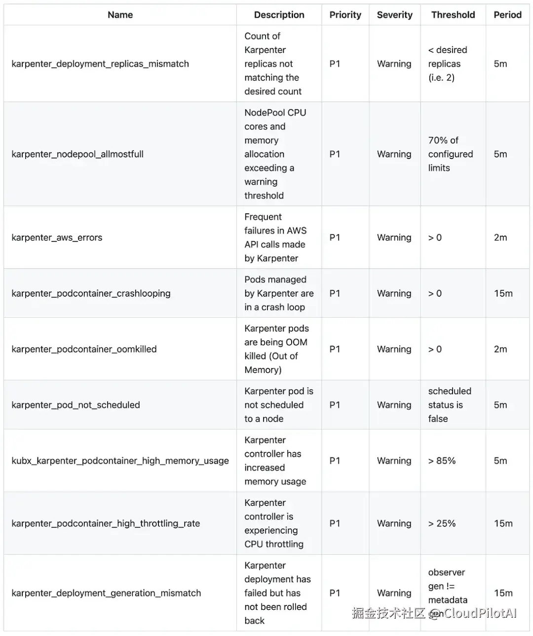 这些告警能及时通知 Karpenter 的运行异常,确保我们快速响应并避免服务中断。以下是已配置的告警列表: