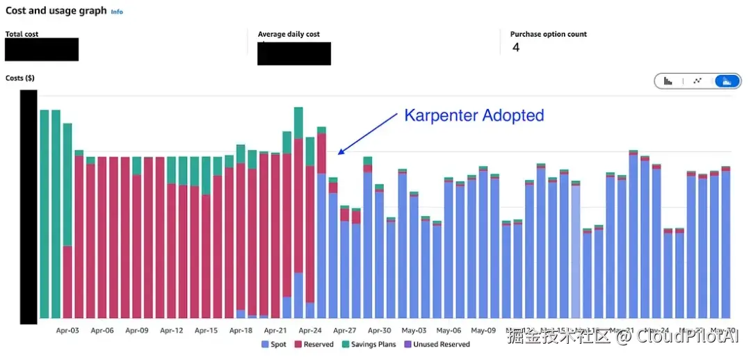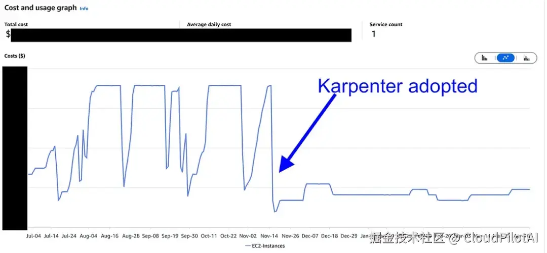 以下是 Karpenter 带来实际效益的具体场景(截图来自 AWS 配置,成本与使用数据已脱敏):