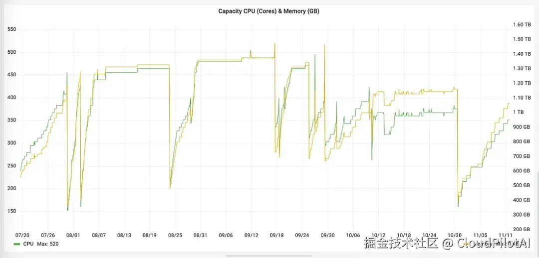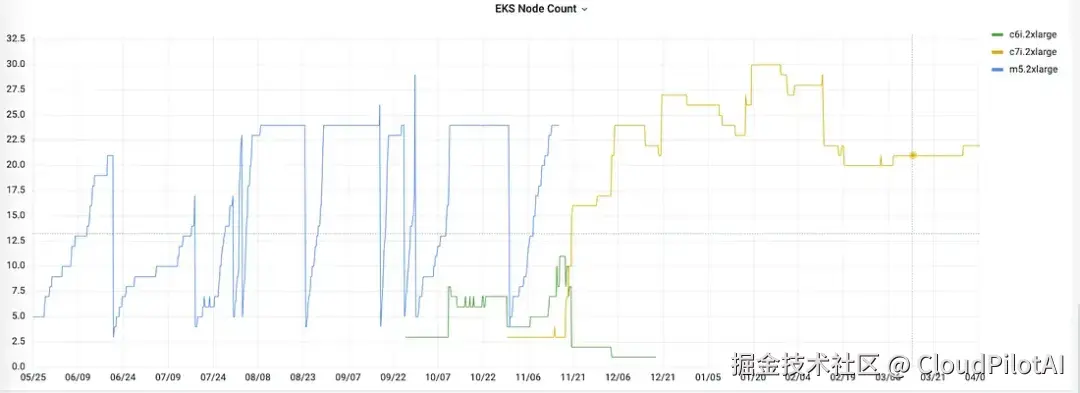 采用 Karpenter 后,控制器自动识别到资源浪费问题,并将实例类型从原来的 M 系列切换为更合适的 C 系列。优化后的资源利用率变化如下图所示。