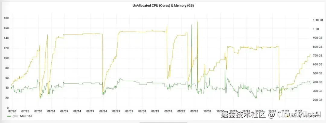 在已配置的资源中,约有167个 CPU 核心和 1.09TB 内存处于闲置状态。