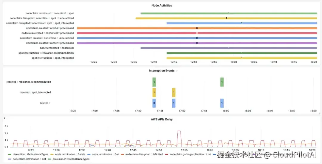 除节点部署指标外,Karpenter 还提供了资源整合、节点中断、终止等操作的监控指标。通过这些指标,可以实时掌握集群状态。具体指标和仪表盘配置将在"可观测性"章节详述。