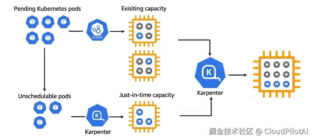 与传统扩缩器不同,Karpenter 的工作机制是: