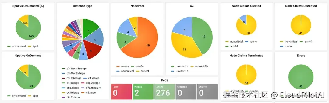 Karpenter 提供日志和 Prometheus 指标,具备完善的可观测能力(具体指标详见官方文档)。我们基于这些数据为不同角色定制了专属监控看板:
