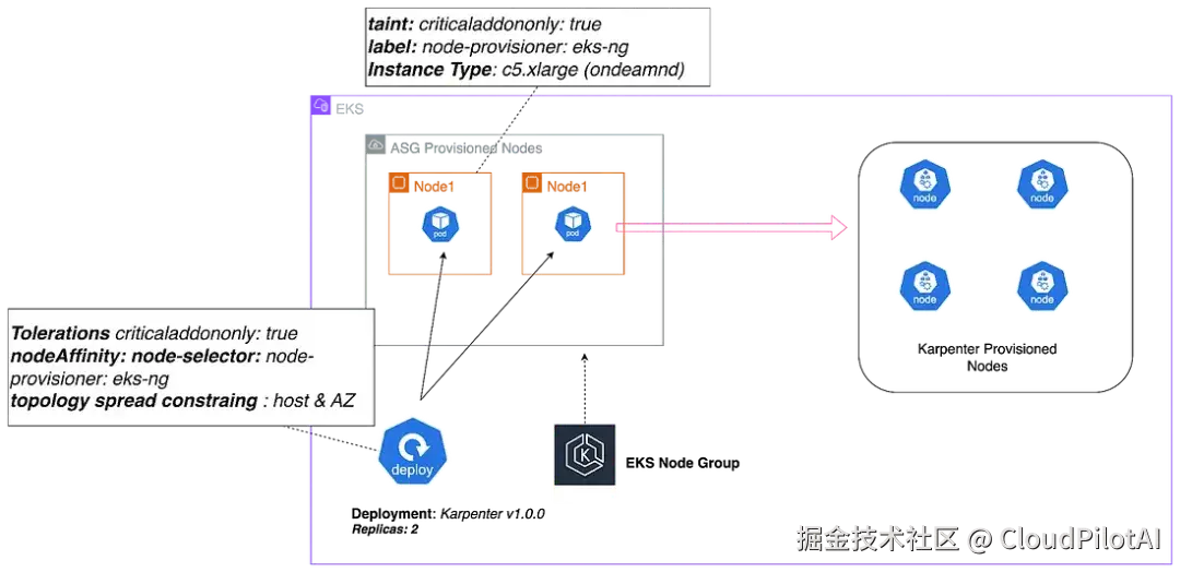 为确保高可用性,我们在每个集群的EKS节点组上均部署两个 Karpenter 副本。具体部署结构如下图所示: