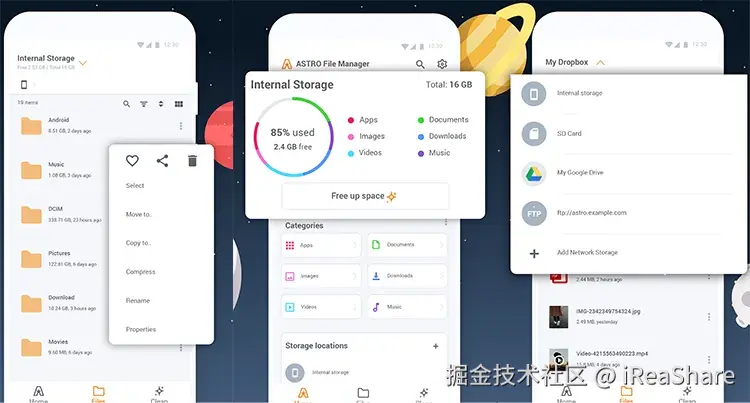 ASTRO 文件管理器在 Android 平台上拥有悠久的历史,是广受认可的文件管理器之一。它定位于面向普通用户的一体化文件整理和清理工具,兼具基本的文件管理功能以及强大的云和存储优化功能。