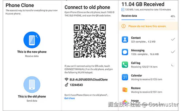 华为开发的免费应用程序“手机克隆”可供Android和iOS用户使用。它使用户能够轻松地将数据从一台设备传输到另一台设备,只需点击几下即可实现高达每分钟 8 GB 的超高速无线文件传输。该软件支持联系人、照片、视频、消息、通话记录甚至应用程序的传输。