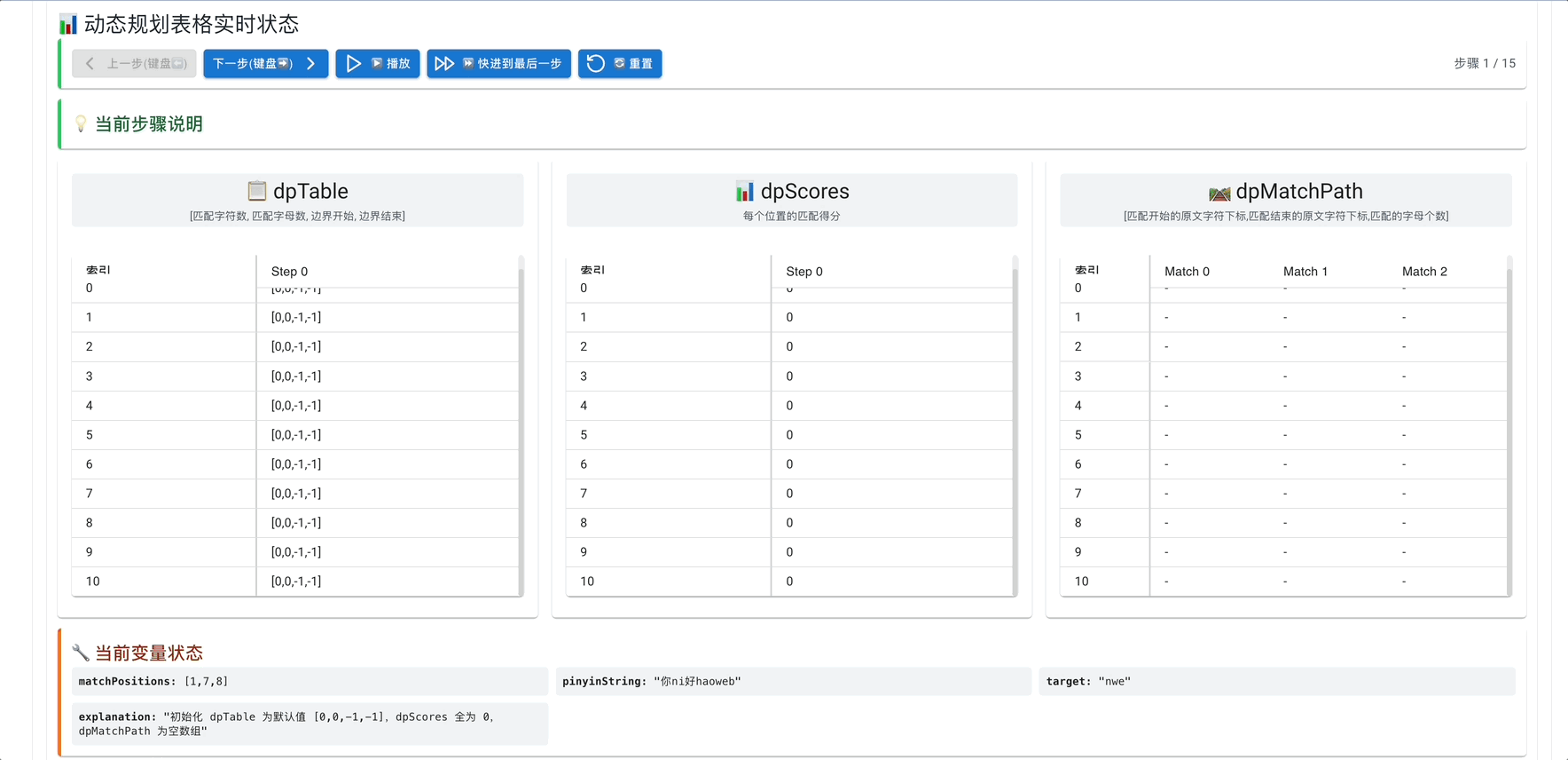 - dpTable:[匹配字符数(包括中文), 匹配字母数(包括拼音、英文和标点字符), 边界开始, 边界结束]