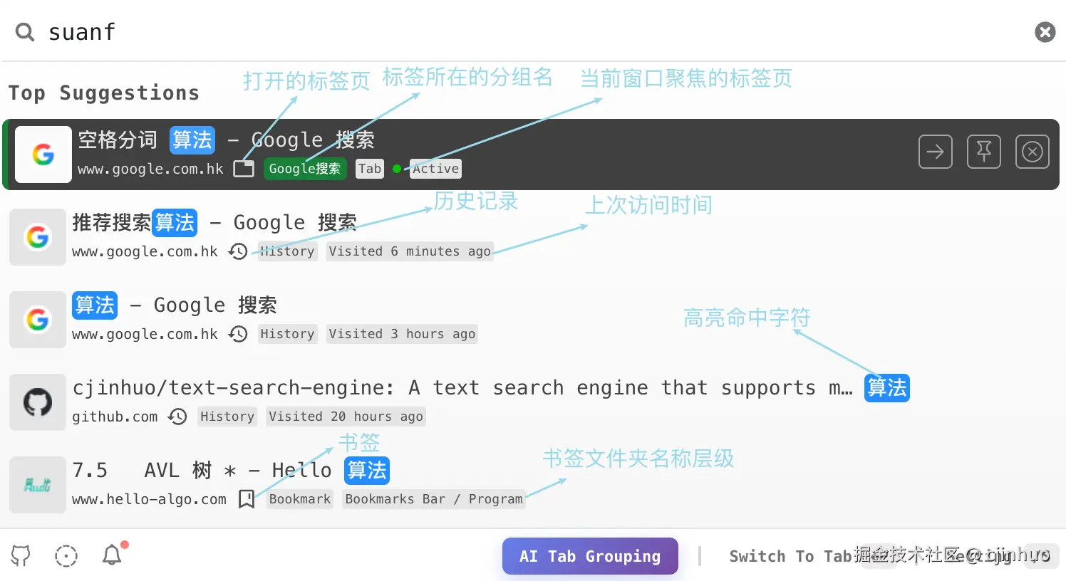 /ai后 enter 就会触发 AI 标签分组 - 通过快捷键来 pin、unpin、打开历史记录、打开当前书签位置等等