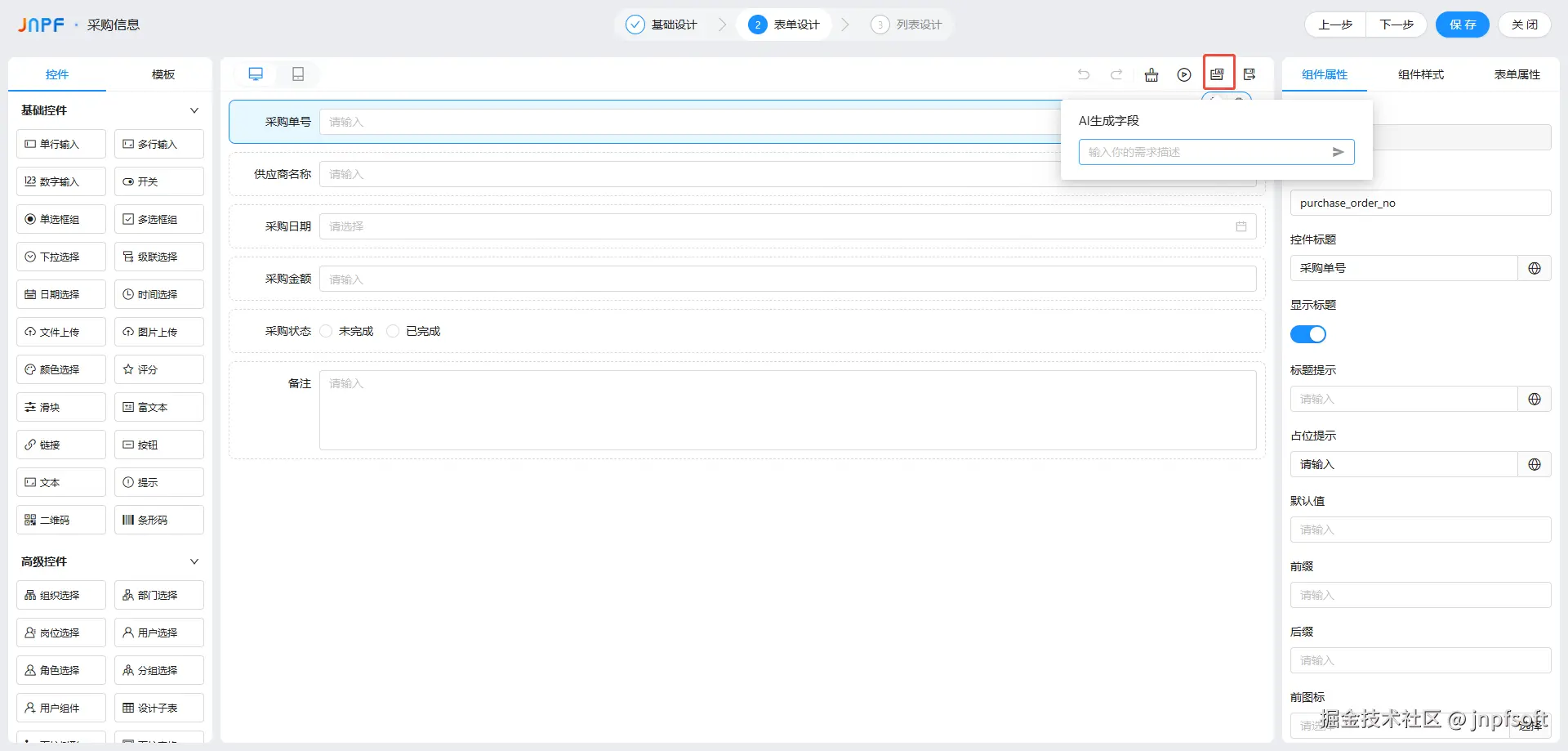 在 “表单设计” 页面点击 “AI 建表”,弹出输入框,填写需求描述(如 “采购信息表,包含采购单号、供应商名称、采购日期、采购金额、采购状态”),文字别超过 100 字(平台限制);