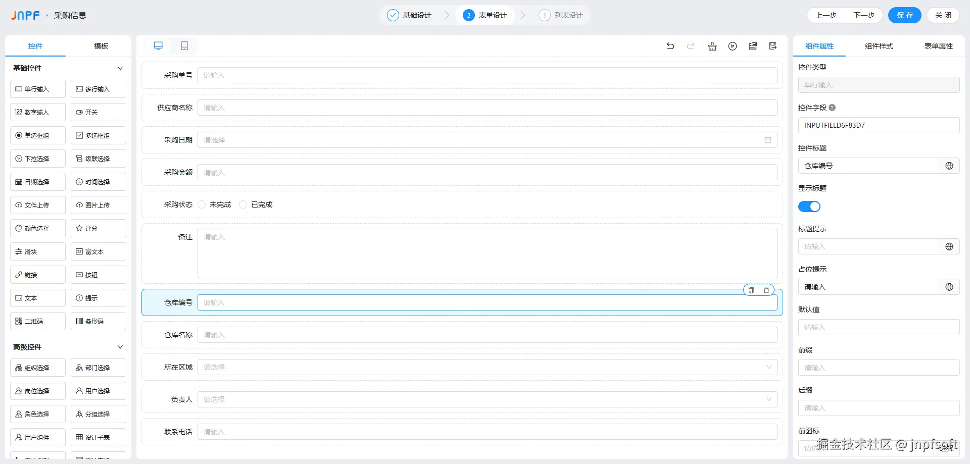 可手动修改字段名称(如把 “仓库编号” 改 “库房编号”)、调整控件类型(如把 “单行输入” 改成 “下拉选择”),属性配置和手动新建一致。