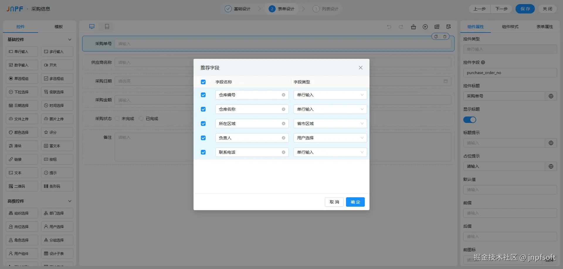 系统会推荐匹配的字段(如 “仓库编号 - 单行输入”“所在区域 - 省市区域”),勾选需要的字段,点击 “确定”,字段会自动添加到画布中;