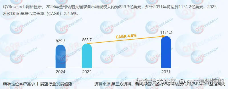 根据QYResearch最新调研报告显示,2024年全球轨道交通装备市场销售额达829.3亿美元,预计2031年市场规模将增至1131.2亿美元,2025-2031年期间年复合增长率(CAGR)为4.6%。这一增长态势反映出全球轨道交通装备市场的强劲需求与持续扩张潜力。