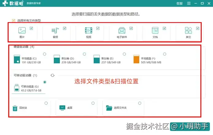 步骤1: 在电脑中,打开该软件,进入首页后选择文件和扫描位置,按下“扫描”按钮;