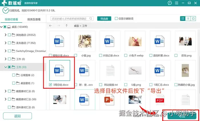 步骤2: 选择需要恢复的文件后,按下“导出”;之后在“浏览文件夹”中选择文件的暂存位置。