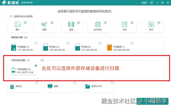 数据 蛙恢复专家虽然是一个电脑数据恢复软件,但是它的扫描范围十分广泛,只要将目标U盘提前插入电脑,我们就能让其化身为U盘数据恢复软件,尝试将U盘中丢失的文件找回。