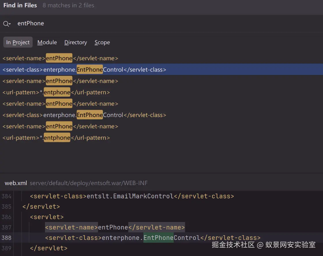 先在xml文件寻找接口对应后端代码,该接口匹配后缀.entphone,对应代码为:enterphone.EntPhoneControl类。
