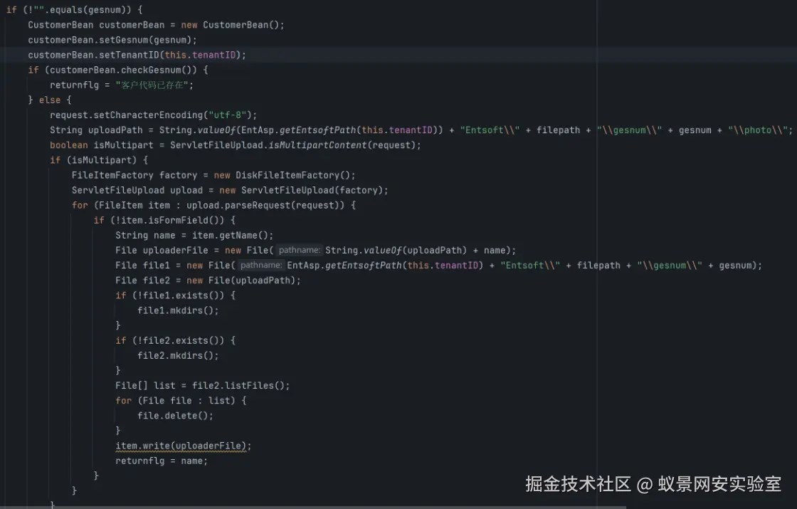 这一步是关键:若checkGesnum()方法在gesnum为null时返回false(即认为"客户代码不存在",符合业务逻辑,因为null通常不是有效的客户代码),则会进入else分支,执行文件上传逻辑。