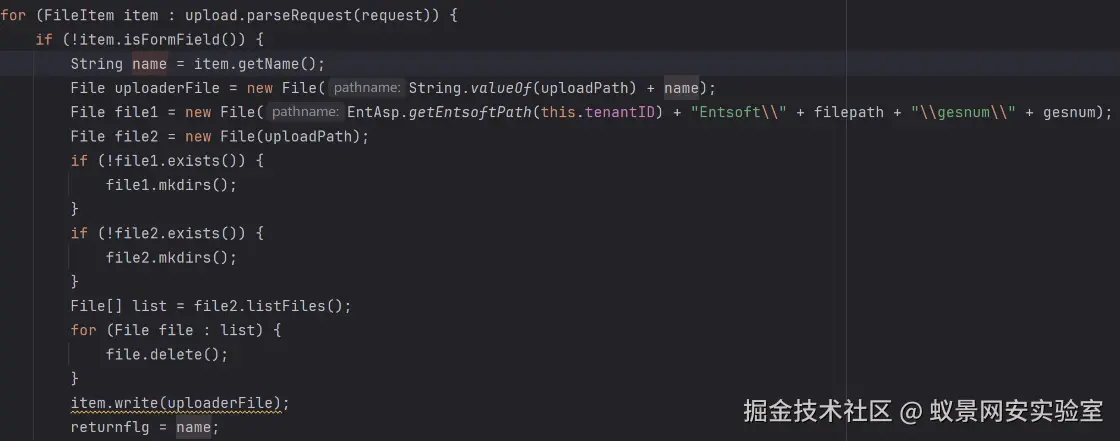 随后通过如上文件获取文件名,并直接进行文件上传,由于未进行后缀校验,从而可上传jsp文件,造成RCE漏洞。