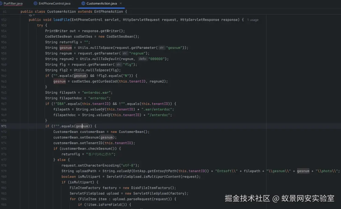而且该系统是tomcat容器,基于该容器对;的解析特性,不会匹配到;后面的内容,也就是在进行路由匹配时,只会匹配到CustomerAction.entphone,从而使得CustomerAction.entphone;.js?method=loadFile顺利进入过滤器层面的校验,并且此时获取的后缀又是.js,处于白名单后缀,从而实现权限绕过。