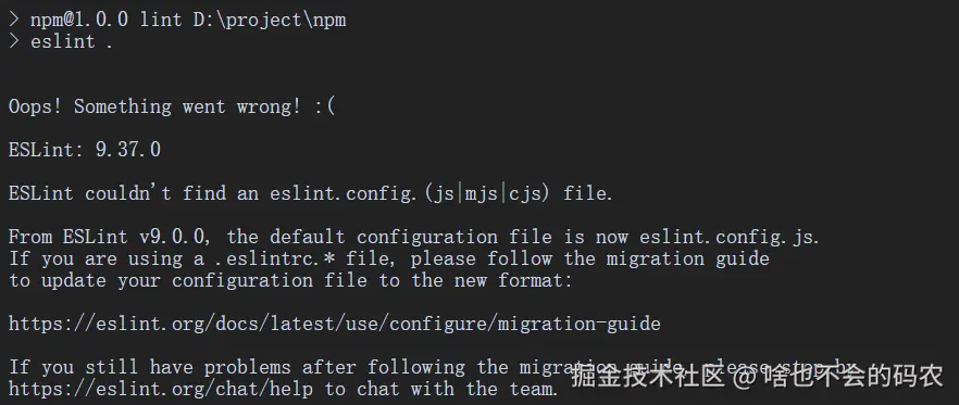 不慌,阅读报错信息发现,只是缺少一个配置文件。那就在项目根目录下新建一个elsint.config.js文件。并且配置导出一个数组
