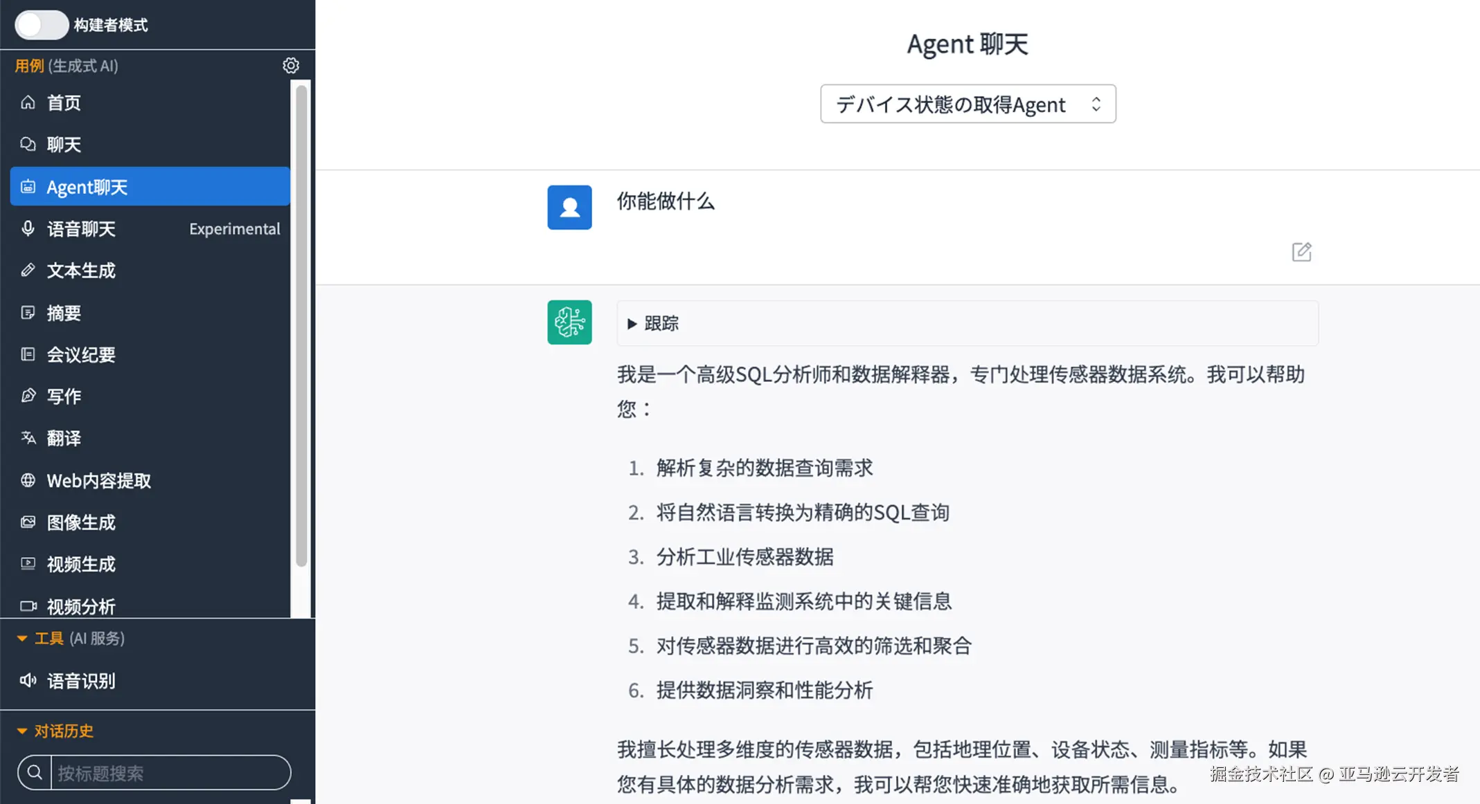 - Agent Chat:通过API集成外部系统,执行复杂的业务任务