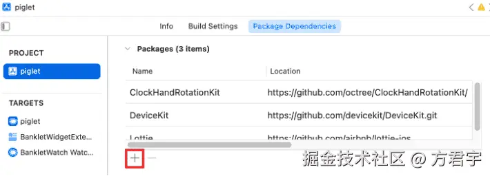 打开Xcode项目,点击左侧的项目名称 – PROJECT – 项目名 – Package Dependencies,点击“添加”按钮,引入GitHub第三方库ClockHandRotationKit(github.com/octree/Cloc…)。