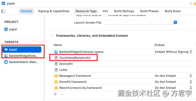 点击左侧的项目名称 – TARGETS,分别检查主应用和小组件的General – Frameworks, Libraries, and Embedded Content,是否包含ClockHandRotationKit框架。