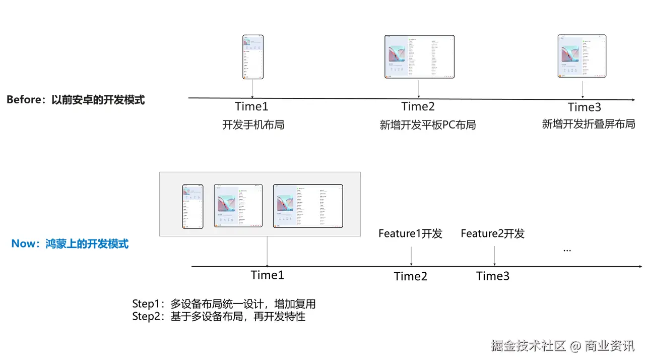 第四步:调测,首先进行多设备、多尺寸的预览;其次,获取多设备的调测环境;最后在多设备进行运行调试,提前检验多设备上的UX问题,确保功能和界面在不同种类设备上无异常。
