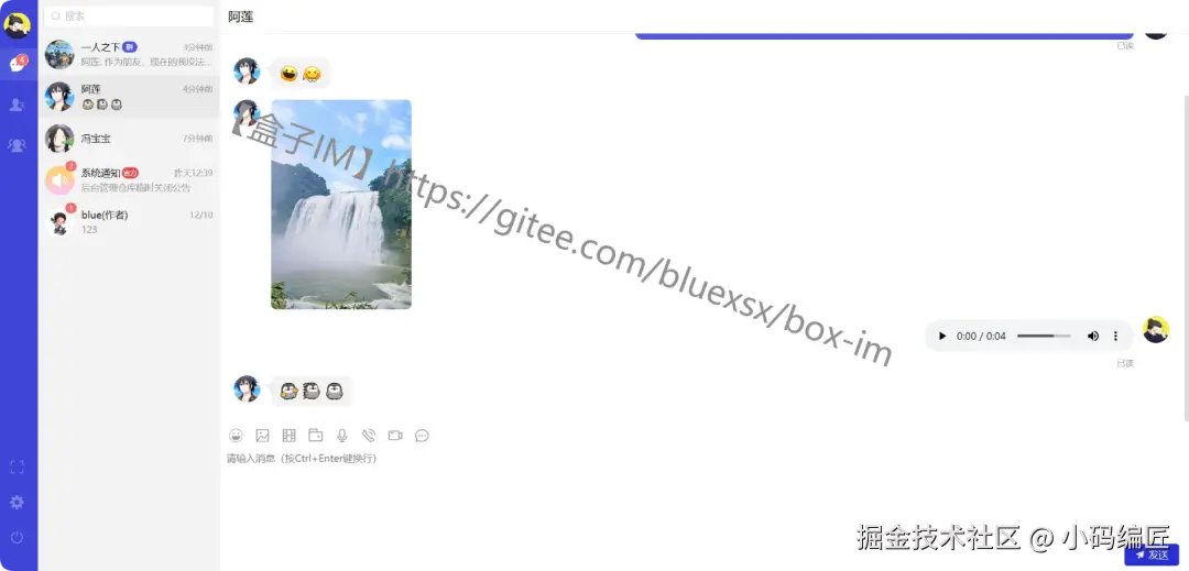 最近,在找一个轻量、灵活、可二次开发的开源聊天工具时,发现了"盒子IM"这个项目。它不仅界面清爽、功能完整,更重要的是,它完全不依赖第三方收费组件,后端采用SpringBoot + Netty,前端覆盖Web和移动端,非常适合想要自己搭建聊天系统的开发者。