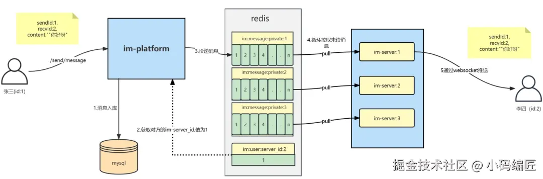 4、用户发送消息时,im-platform 根据接收方所连的 im-server ID,将消息写入对应实例的 Redis 队列中。