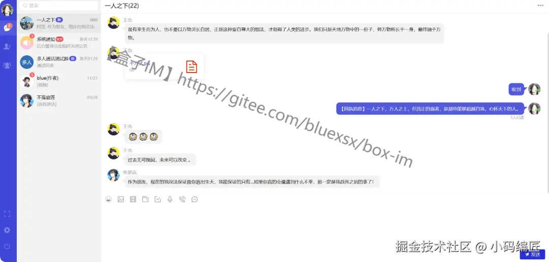总的来说,盒子IM是一个功能完整、架构清晰、易于部署和扩展的开源即时通讯项目。它不仅实现了类似微信的核心功能,还在技术选型和系统设计上展现了很高的成熟度。无论是大家想学习IM系统的实现原理,还是需要一个可商用的聊天工具基础,盒子IM都值得一试。