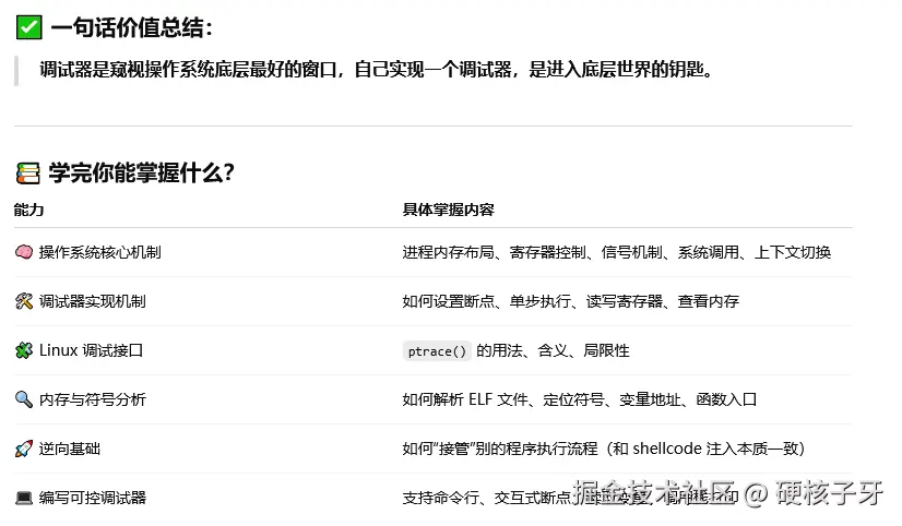 - 你就知道任何调试器的底层是如何实现的。思维打开了,你就能写任何平台的调试器!