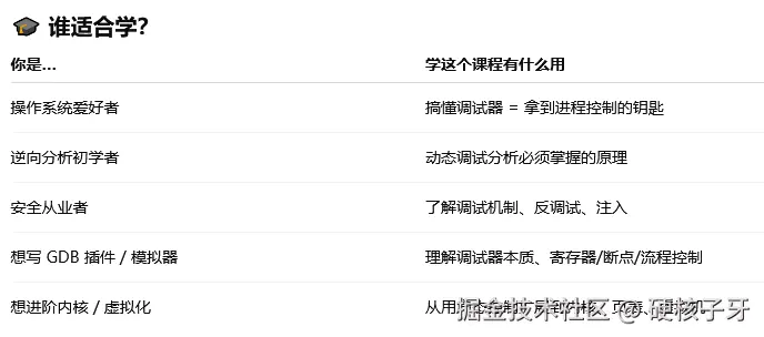 如果你也像我一样,喜欢玩底层,想成为一名顶级黑客,希望有个调试器一站式解决调试一个程序的用户态与内核态,希望写一个自己百分百可控的调试器,这门课也非常适合你
