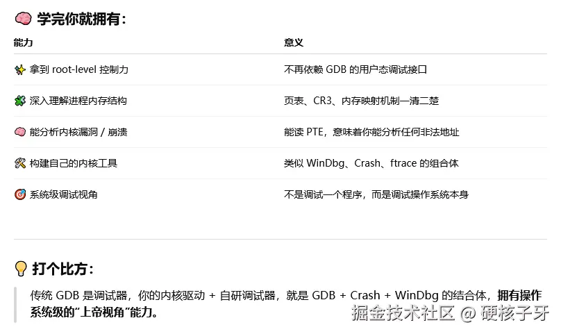 - Linux内核驱动开发新玩法:借助Linux内核驱动,绕过权限限制,读取任意进程内存、解析页表、获取 CR3、设置断点,掌控整个系统的运行状态