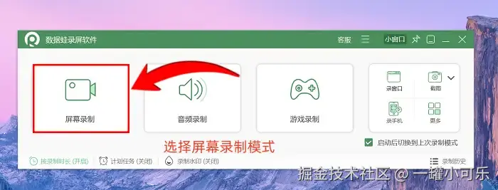 步骤1:打开数据 蛙录屏软件后,界面会清晰展示各类录制模式,其中 “屏幕录制” 模式是日常使用频率较高的模式,像网课内容录制、软件操作演示、线上会议存档等常见场景都能覆盖,下面就以该模式为核心展开说明。