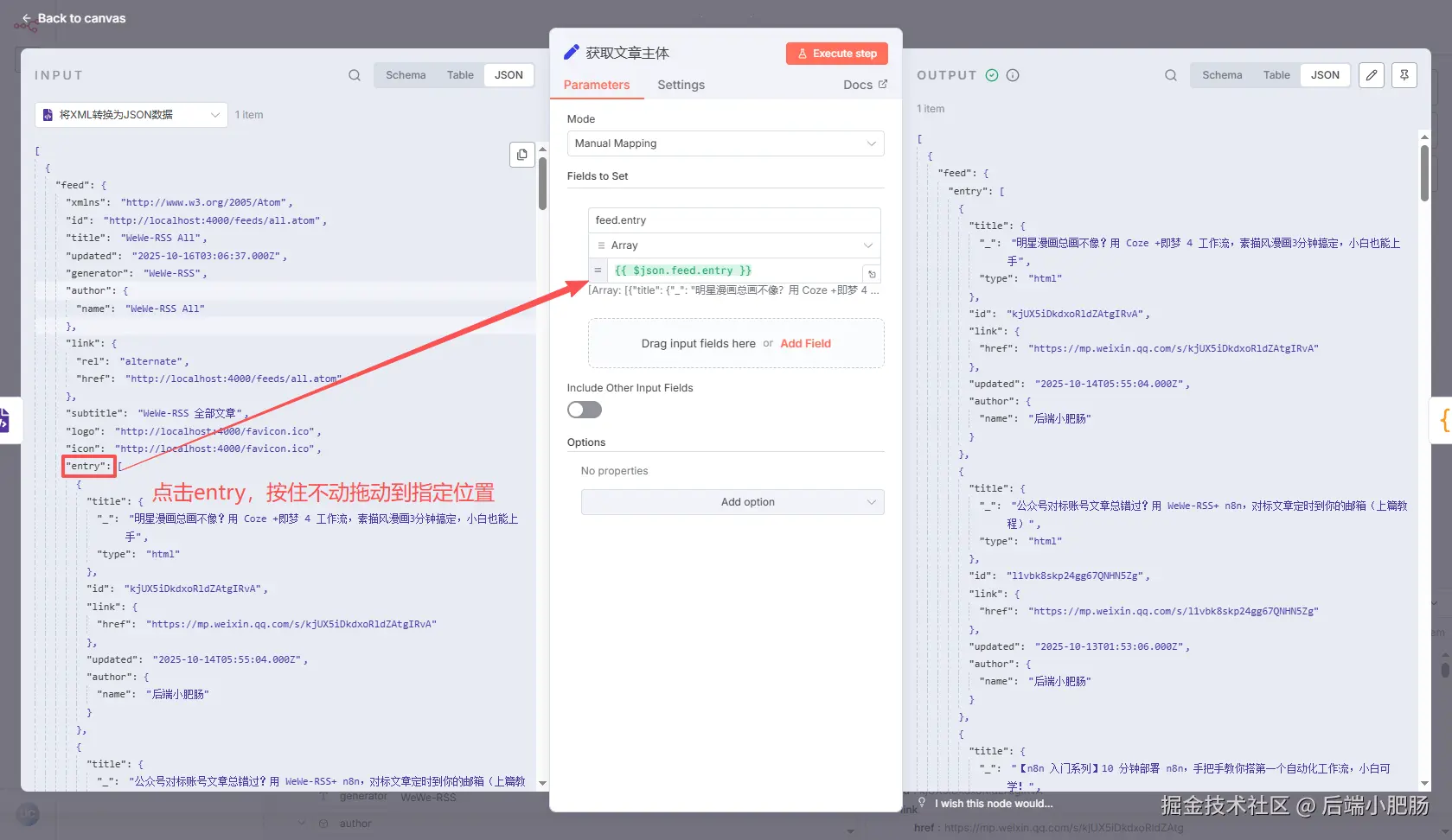 点击【+】按钮添加第4个节点Edit Fields,这个节点的作用主要是取出我们想要的数据部分,在这里我只需要entry部分的数据,故将enty拖动到Edit Fields属性面板。