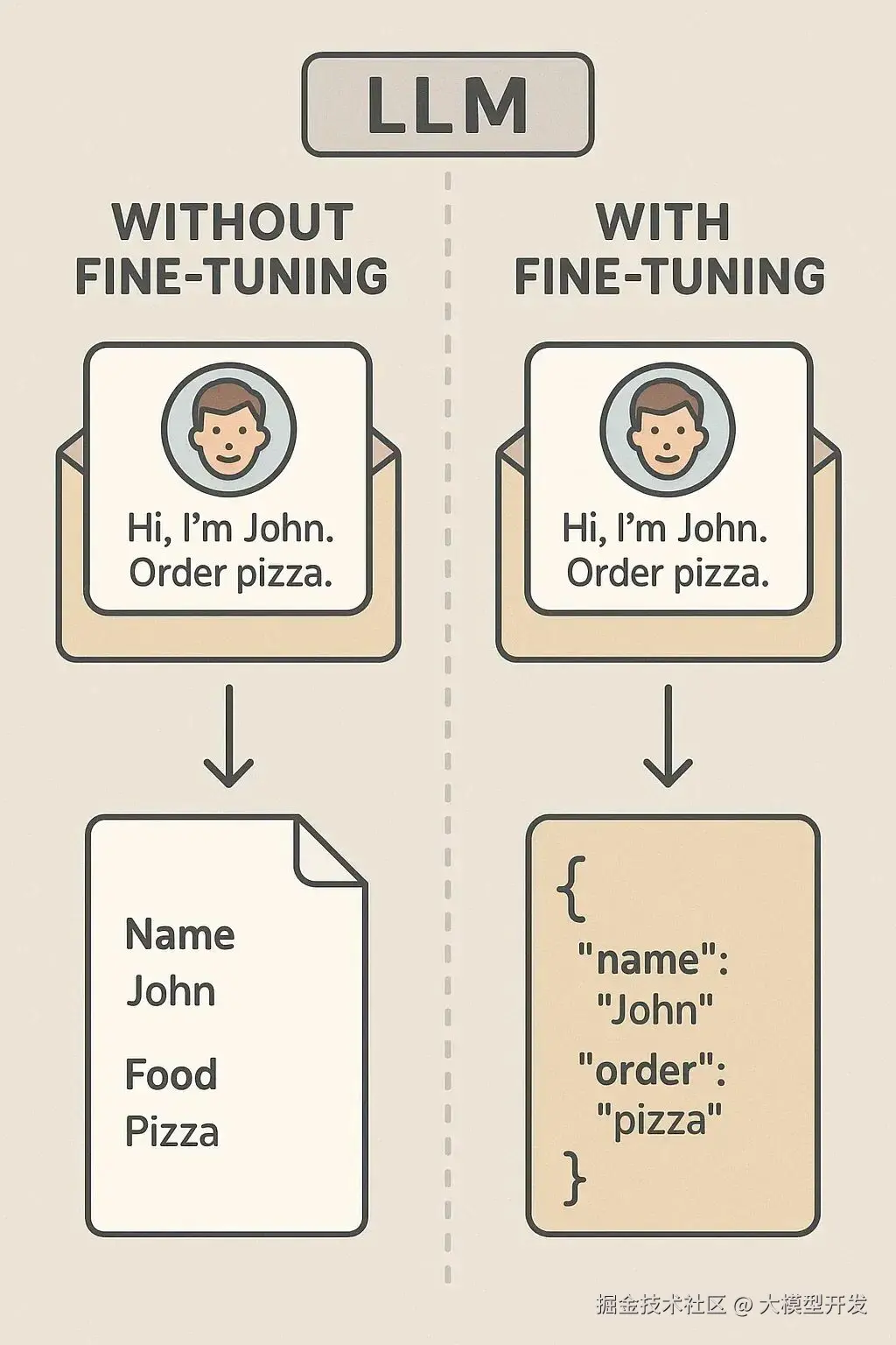 举个例子: 假设你想让 LLM 从乱糟糟的邮件里提取信息。 没微调前: Prompt: “从‘嗨,我是 John。订个披萨。’中提取名字和订单。” 输出:可能很随机,比如“Name: John, Food: Pizza”或者只是个总结。 微调后: 用 100 封邮件例子训练。现在它总会输出 JSON 格式:{"name": "John", "order": "pizza"}。