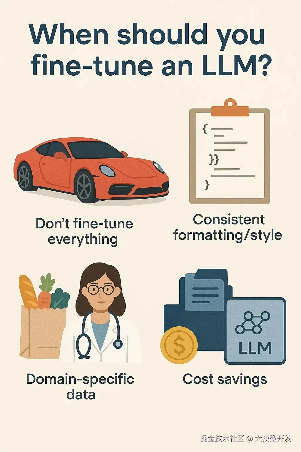 微调是拿一个已经预训练好的 LLM(比如 GPT 或 Llama),它已经很懂得通用语言了,然后针对你的特定任务“调校”一下。你给它喂一些你领域的例子,它就会调整自己的知识,专门为这个领域发光发热。