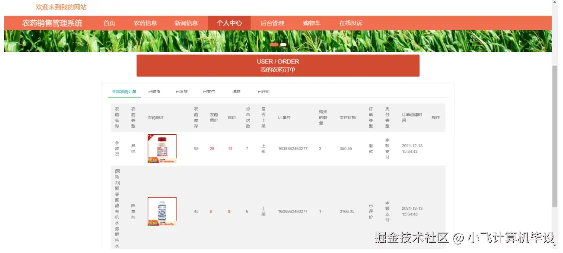 | 商品信息表(goods) | id(主键)、goods_name(商品名)、goods_kucun_number(库存)、goods_new_money(现价)、shangxia_types(是否上架) | 存储农药品信息,管理员控制上架状态,用户仅可见 “已上架” 商品 |