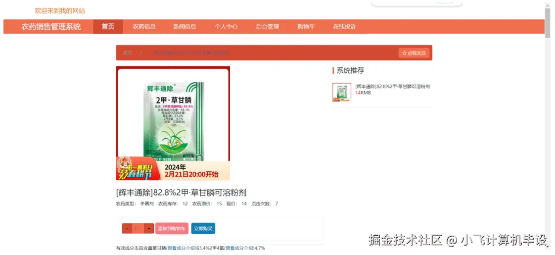 - 用户 - 商品浏览界面:展示农药品封面、名称、现价、库存,库存不足时 “加入购物车” 按钮置灰,支持 “关注商品” 后续查看;