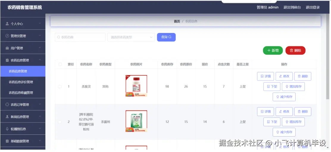 管理员登记农药品信息时,手动填写名称、库存、价格,常出现 “库存录错”“名称错别字”;用户下单后需人工更新库存,一旦遗漏,就会导致 “显示有货但实际缺货”,影响用户信任。