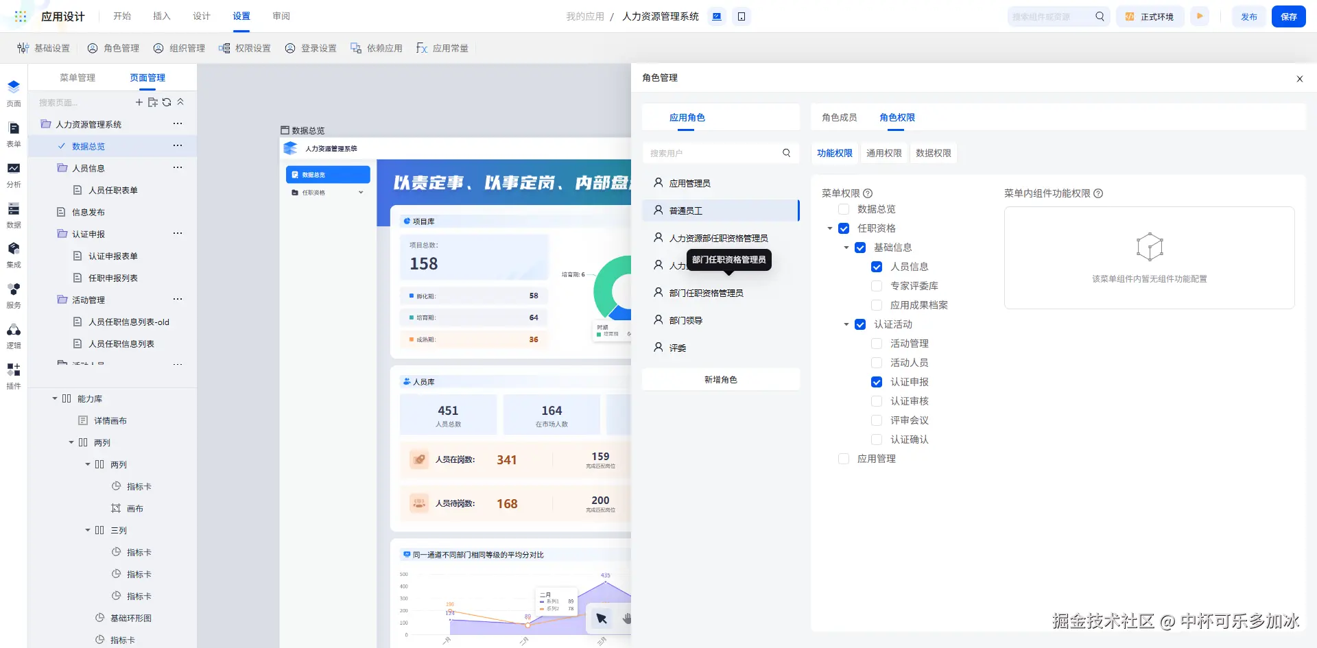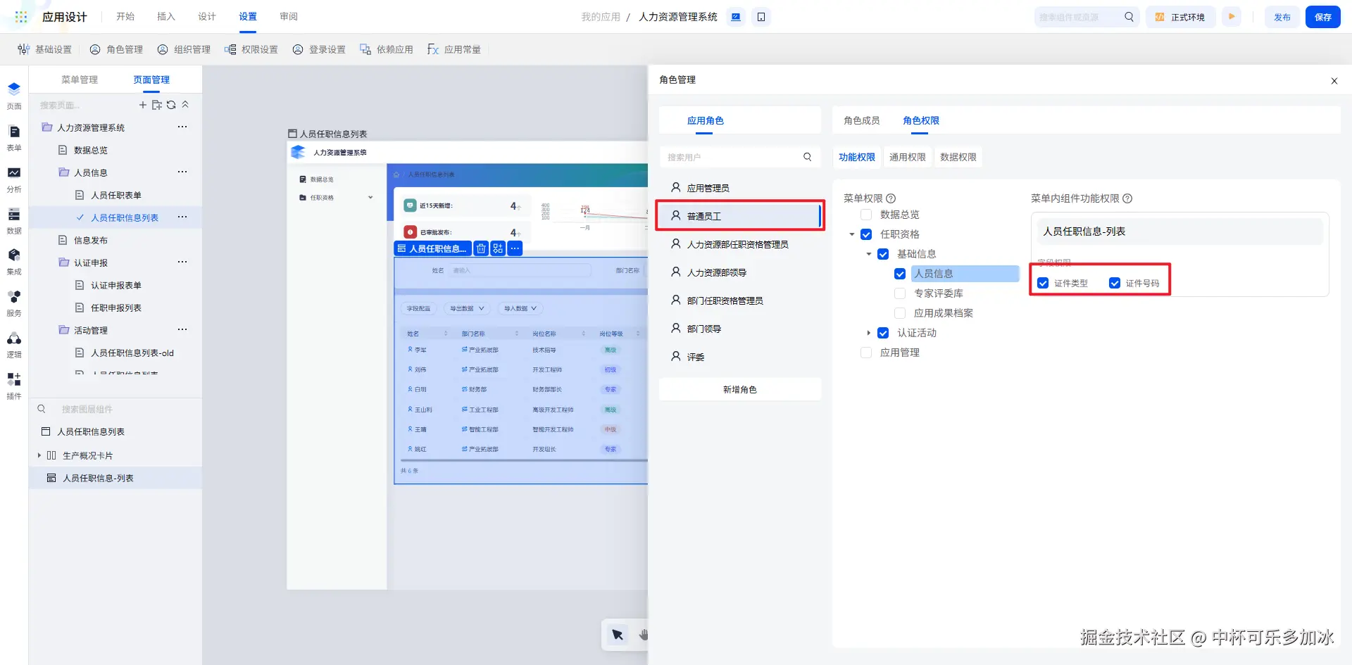 我们通过“应用角色-菜单权限” 配置来控制用户能够访问系统的哪些菜单。例如,对于“应用管理员”‘角色,为其授予所有菜单的访问权限。而对于“普通员工”角色,仅能查看人员信息和认证申报这两个菜单。同理,其他角色也依次设定权限。
