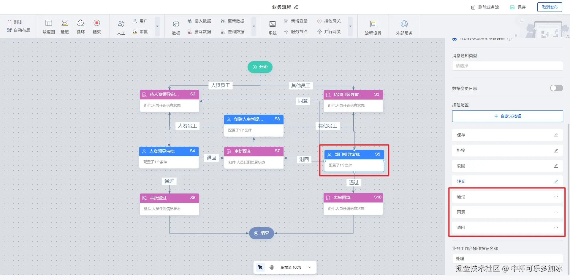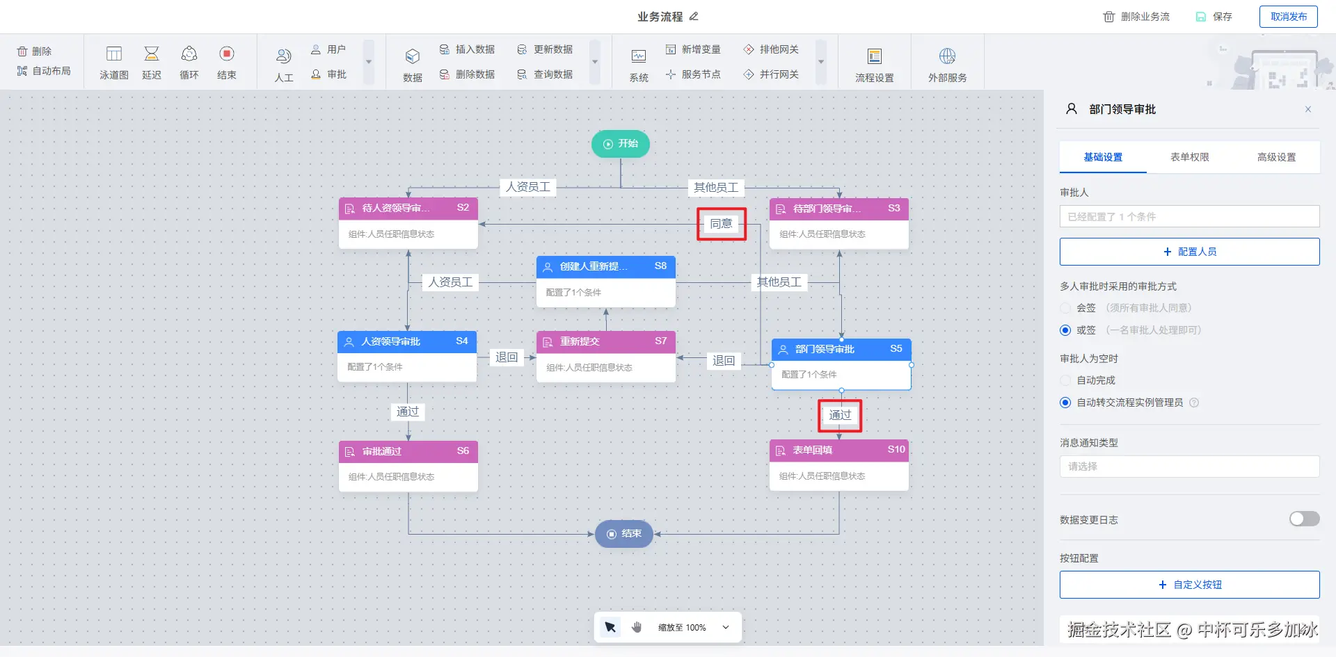 部门领导节点:如果任职的员工的职级超过A级,需额外经过人力资源部领导审批。新增“通过”与“同意”两个按钮,并配置显示条件:“通过”按钮仅当员工职级为A级时对领导可见,点击后可实现一键快速审批并结束流程;“同意”按钮则适用于更高职级的审批流程,点击后触发二次审批流程,来到人力资源部领导处审批。